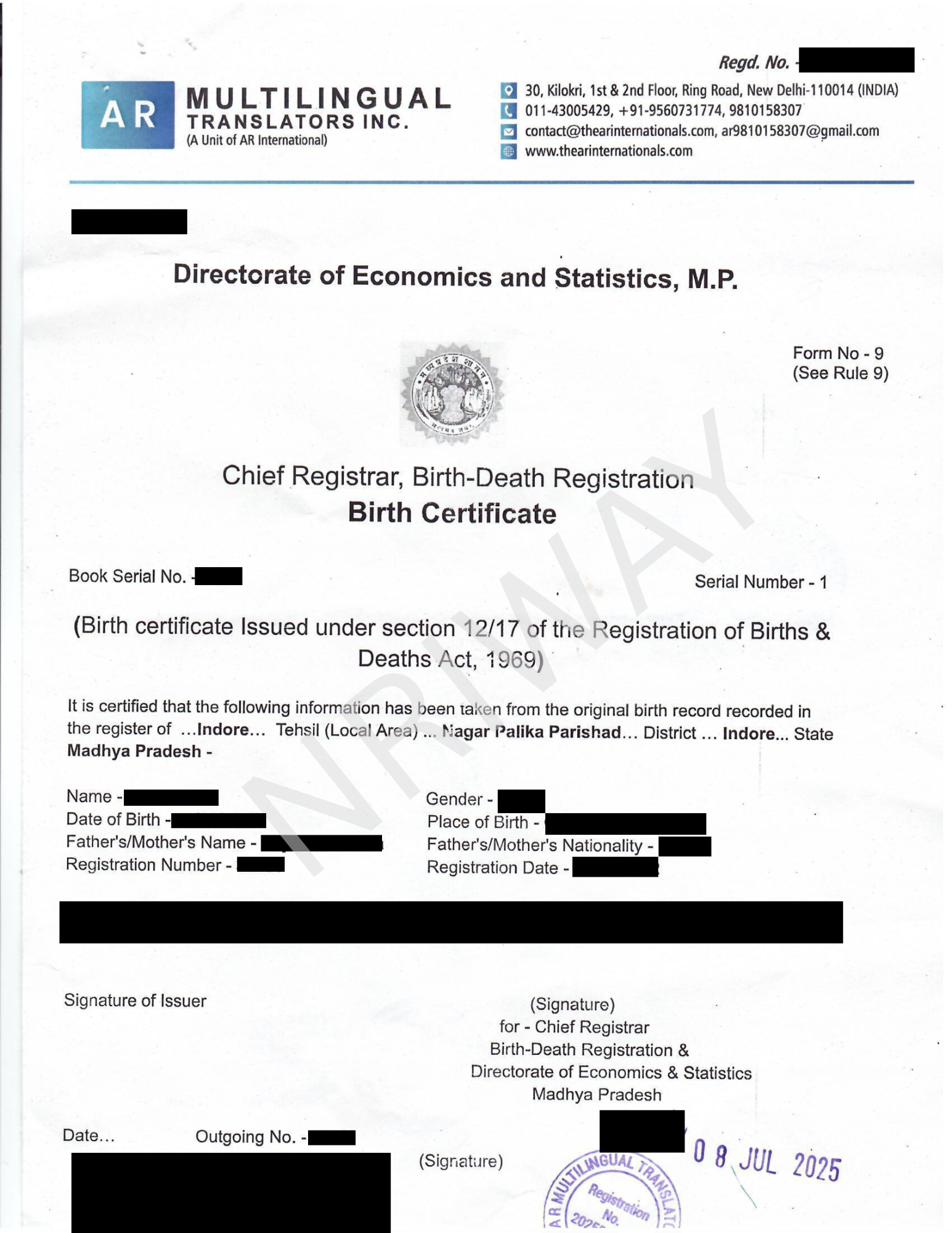 NRIWAY applies for a birth record search at the Municipal Corporation. If the record is found, a Birth Certificate (Form 5) is issued. If no record is available, a Non-Availability of Birth Certificate (NABC - Form 10) is issued. The certificate is signed by the Sub-Registrar of Birth & Death or the Health Department.