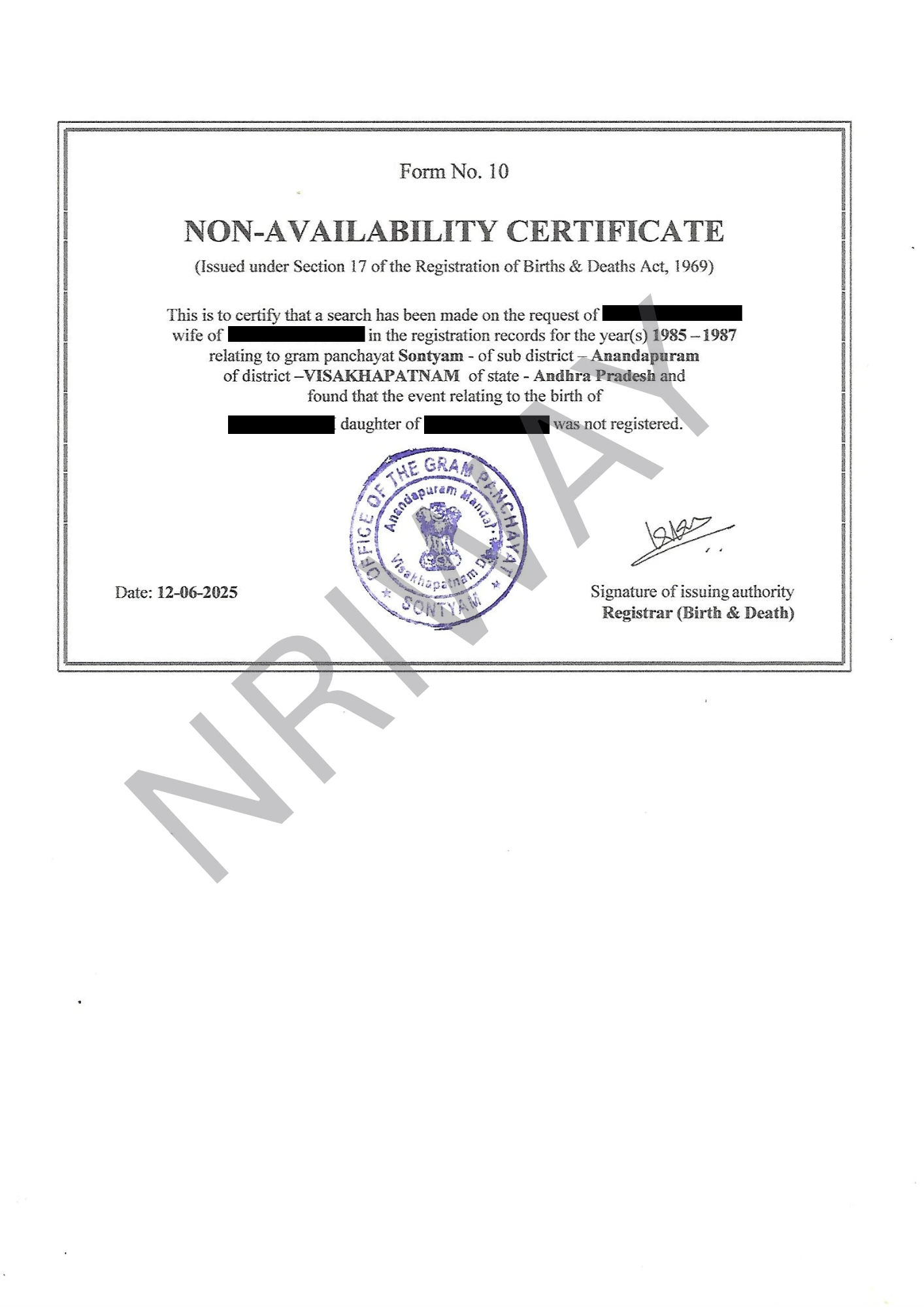 NRIWAY applies for a birth record search at the Municipal Corporation. If the record is found, a Birth Certificate (Form 5) is issued. If no record is available, a Non-Availability of Birth Certificate (NABC - Form 10) is issued. The certificate is signed by the Sub-Registrar of Birth & Death or the Health Department.