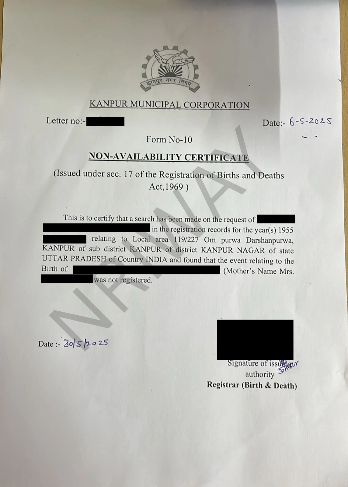 NRIWAY applies for a birth record search at the Municipal Corporation. If the record is found, a Birth Certificate (Form 5) is issued. If no record is available, a Non-Availability of Birth Certificate (NABC - Form 10) is issued. The certificate is signed by the Sub-Registrar of Birth & Death or the Health Department.