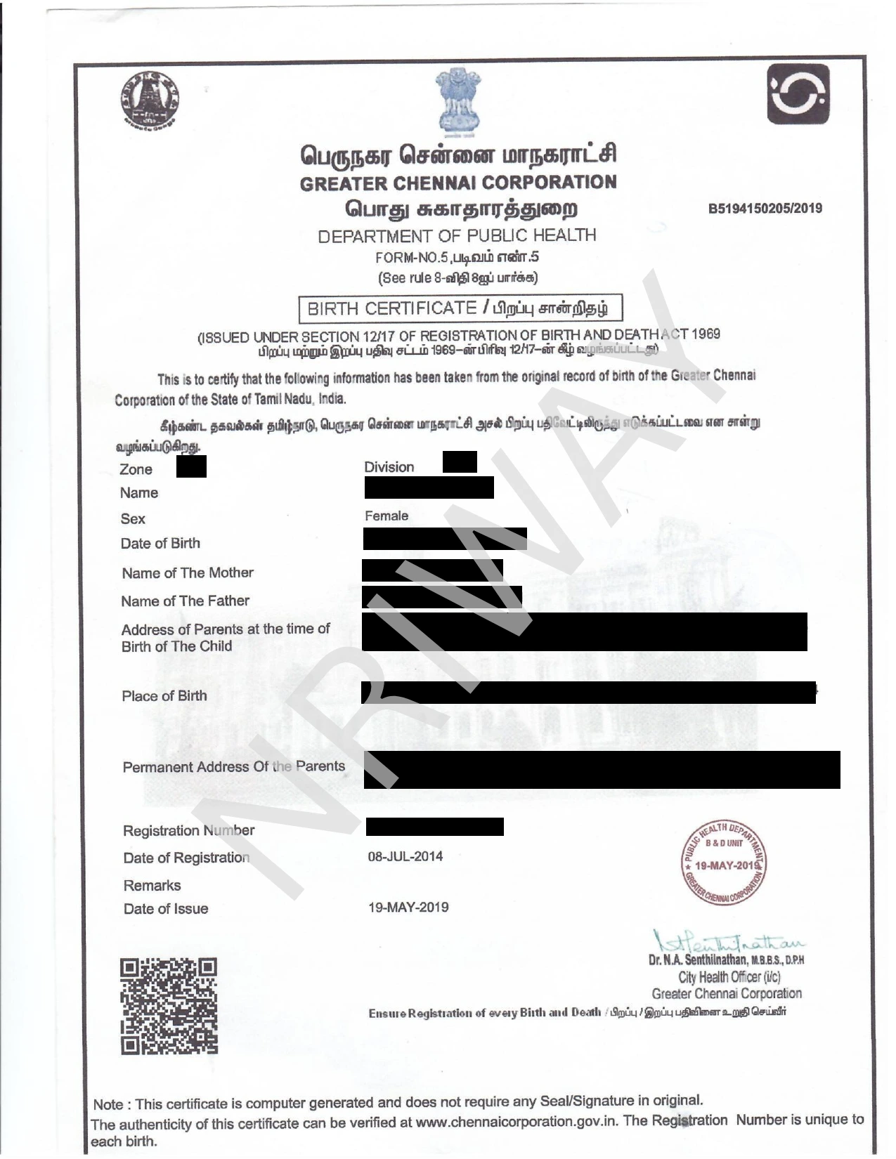 NRIWAY applies for a birth record search at the Municipal Corporation. If the record is found, a Birth Certificate (Form 5) is issued. If no record is available, a Non-Availability of Birth Certificate (NABC - Form 10) is issued. The certificate is signed by the Sub-Registrar of Birth & Death or the Health Department.